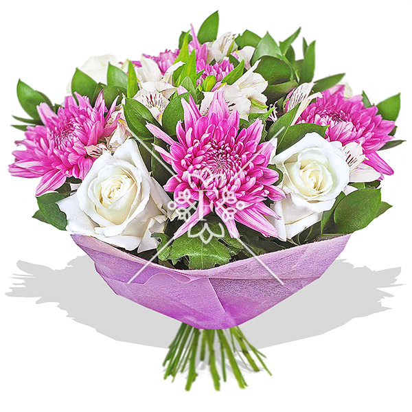 Главную роль в букете между собой разделили белые розы и сиреневые хризантемы, чудесно и живо дополняя друг друга в ласковых  объятиях великолепной эустомы.